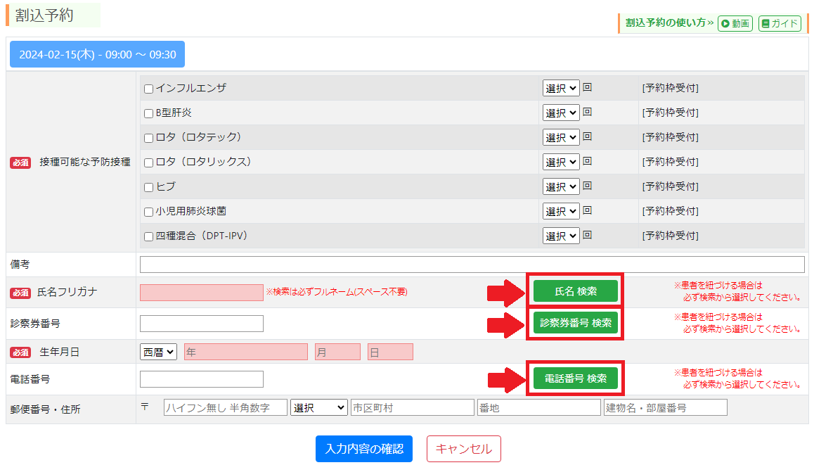 割込予約での氏名検索・診察券番号検索・電話番号検索の候補について(手入力・Uttaro・レセコン)