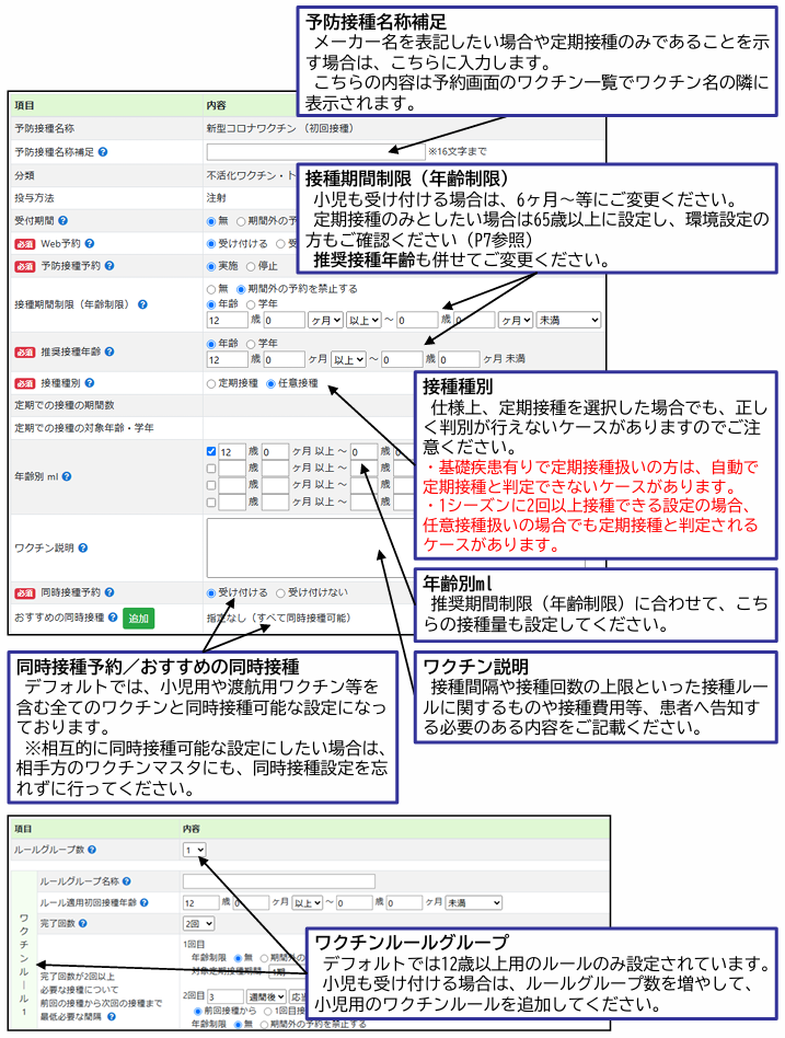 新型コロナワクチン用の設定手順 上部メニューバー「環境設定」から「Uttaro設定」をクリックします。 その次に、左のメニュー「新型コロナワクチン用」をクリックします。 ①例外的な接種間隔 こちらには、ワクチンマスタでの設定ではチェックできない「シーズンの変わり目を挟んで予約するときの接種間隔」を設定します。 (例:8月に接種し、9月に再度予約する場合の間隔) シーズン内の接種間隔や初回接種の接種間隔は、各ワクチンマスタのルール設定で行います。 ②60歳~64歳は基礎疾患を有する方のみ受け付ける ...